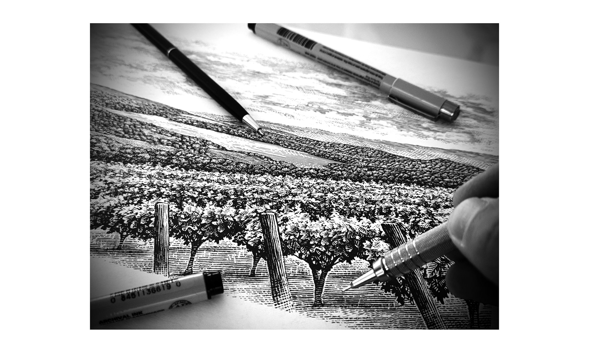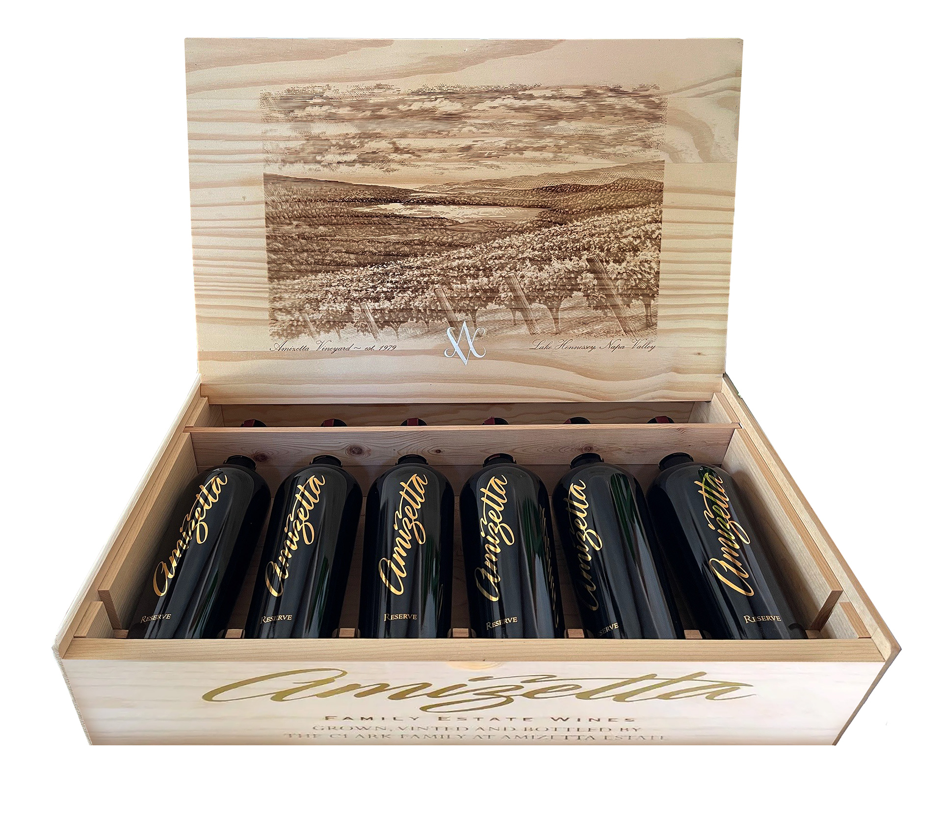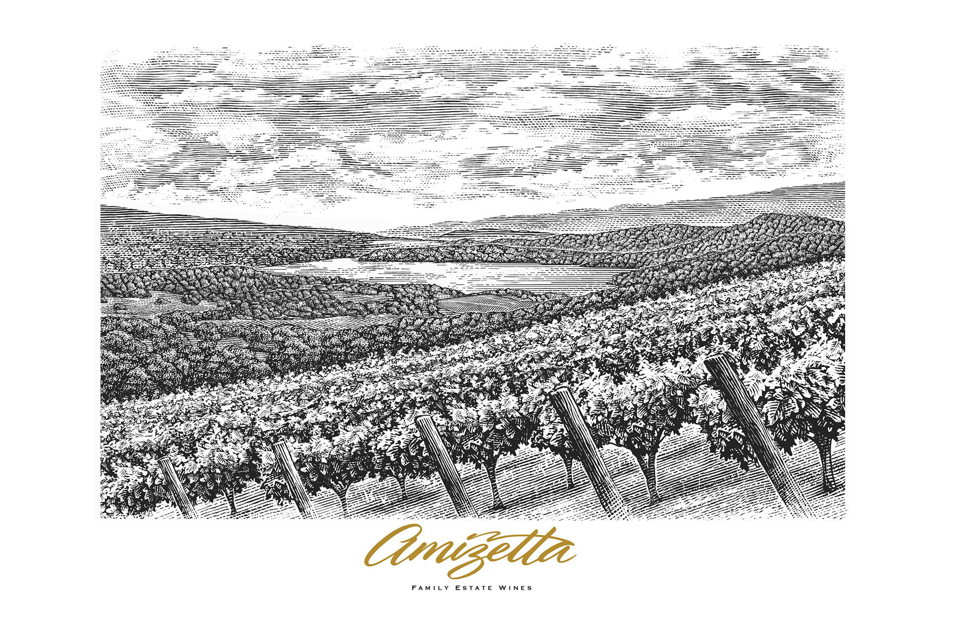 Amizetta Family Estate Wines commissioned Steven Noble to render a customized illustration for their "limited edition" wooden box which contains the vineyard scene illustration laser etched into wood. The illustration depicts the Amizetta vineyards in the foreground, located in Napa Valley, overlooking Lake Hennessey into the distance. The illustration was intricately "hand-cut" using scratchboard engraving technique for that authentically handcrafted look and feel. No computers, iPads, filters, Ai, etc.. were ever used in the process. Just pure talent.