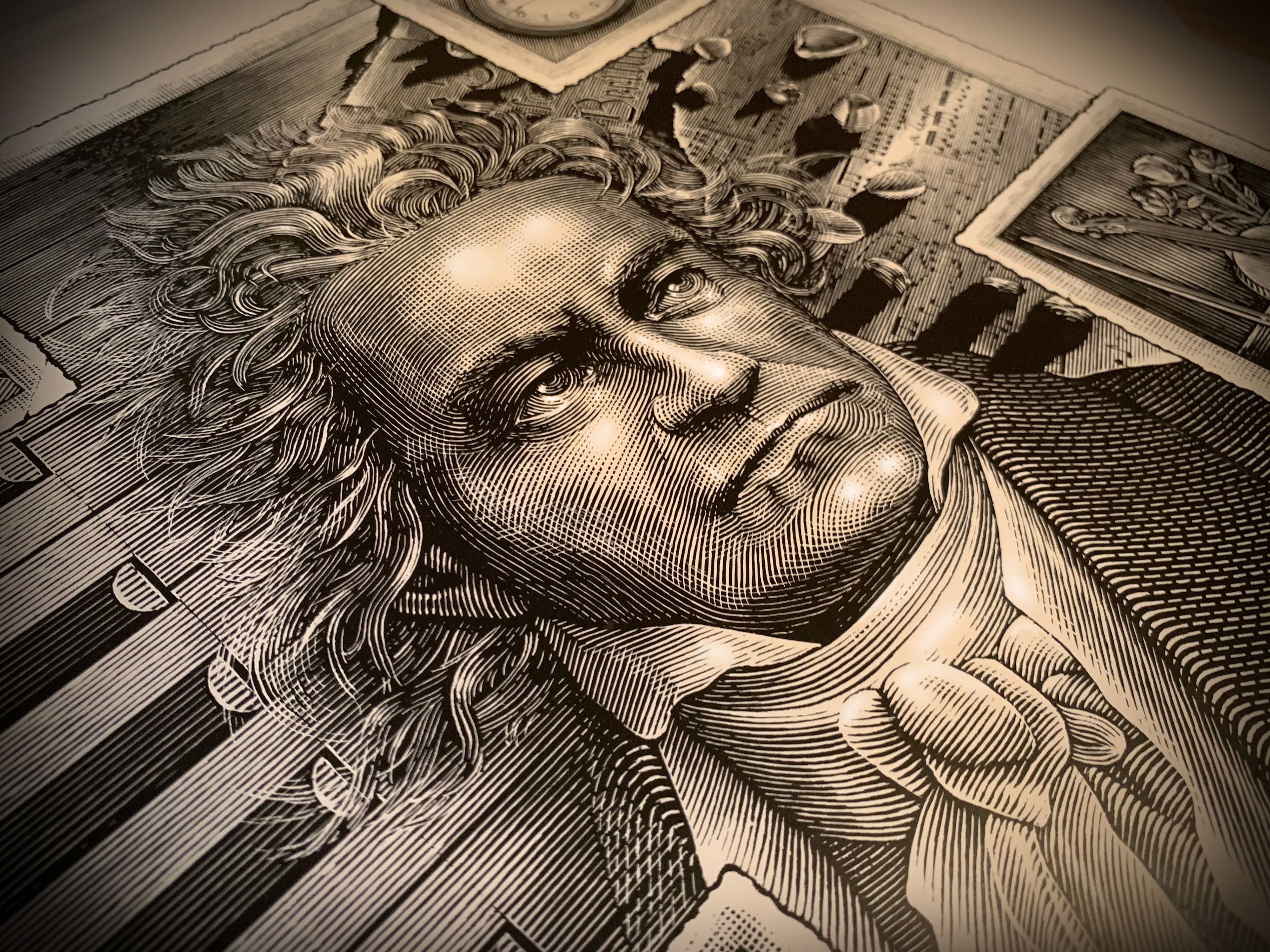 The Ludwig van Beethoven commemorative poster created and rendered by Steven Noble. Beethoven (December 1770 – March 1827) remains one of the most admired composers in the history of Western music with his works ranking amongst the most performed of the classical music repertoire. His works span the transition from the classical period to the romantic era in classical music. The illustration was rendered and etched by hand on a scratchboard engraving style.