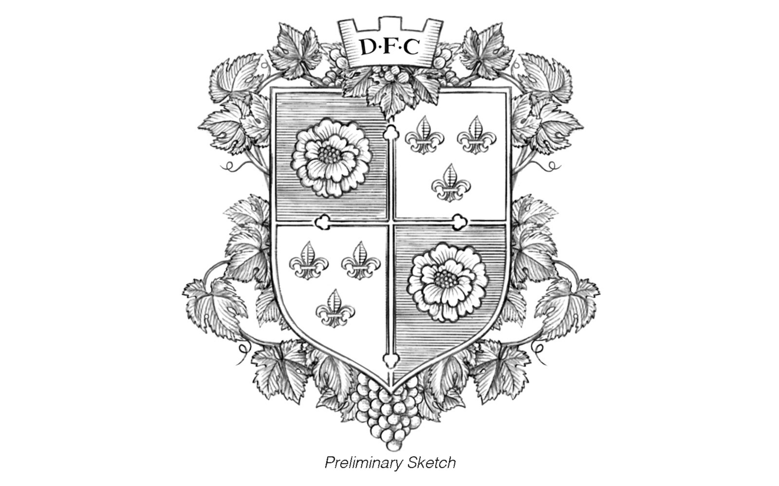 Figure / Prophet commissioned Steven Noble to render a crest for Domaine Franco-Chinois that includes a heraldic shield with surrounded by grape leaves and combines the the French and Chinese cultural symbols like the fleur de lis and the Chinese plum blossom flower symbol. The crest and is illustrated in a engraving style.