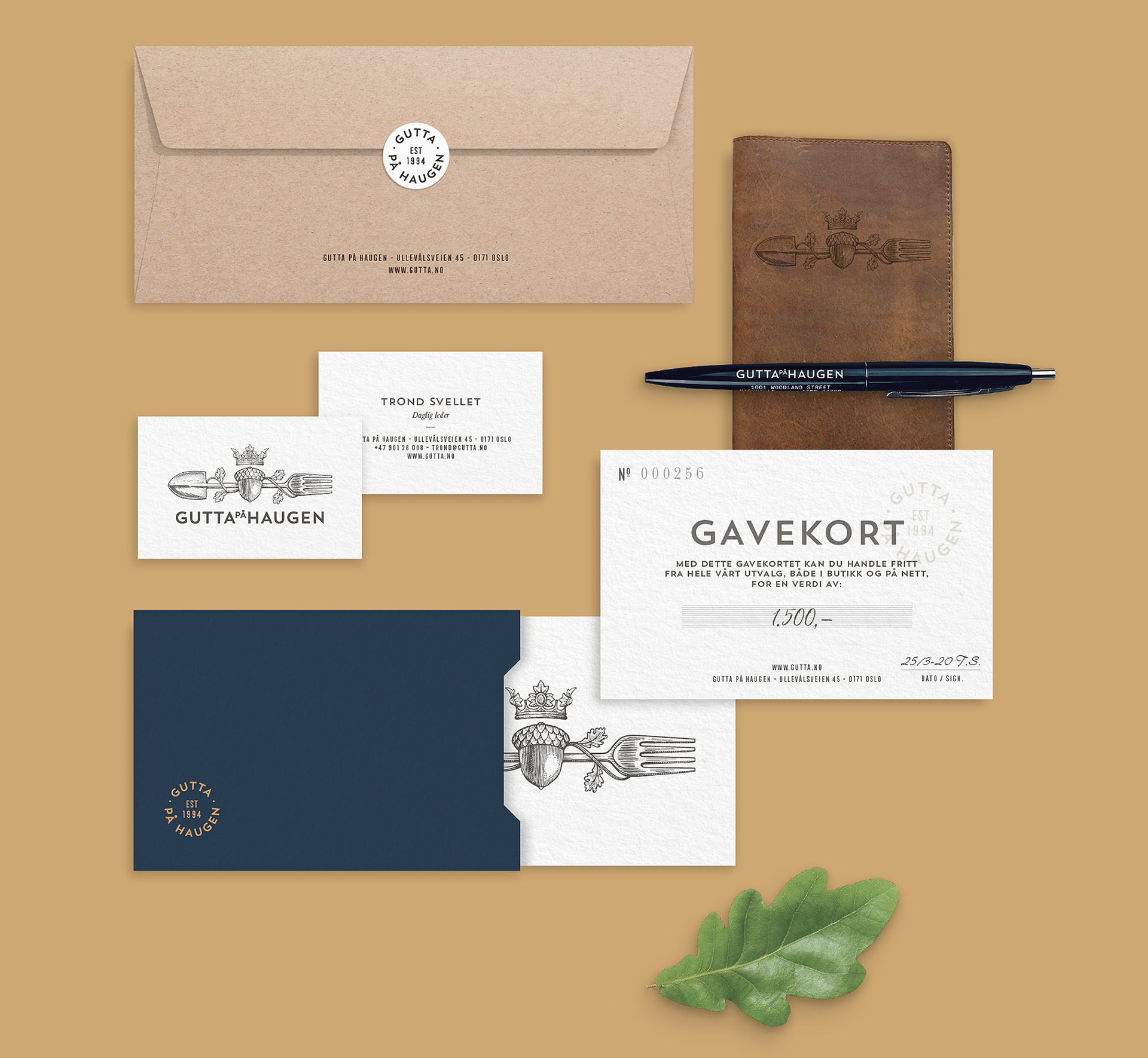Hoien Design commissioned Steven Noble to create a customized logo mark for Gutta på Haugen. The illustrated logo includes a classic crest like mark that includes a shovel flanked by a fork with crown positioned over an acorn. The logo mark was used on all packaging, branding, web and other media applications. The artwork was hand-drawn in a scratchboard woodcut/engraving style.