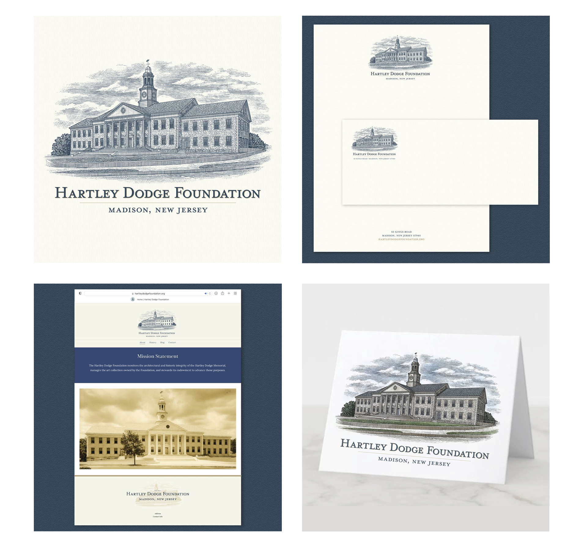 The client is a foundation that manages the historic integrity and maintenance of the Hartley Dodge Memorial building, which serves as the borough hall in Madison, NJ. The building was given to the borough of Madison by Geraldine Rockefeller Dodge, and is a focal point landmark of the town. Because their role is centered around the building, they wanted a logo that would highlight the building, and felt that an illustration was the best way to do this. A scratchboard illustration was created by Steven Noble in a detailed and simplified version, to allow for flexibility when using the logo at different sizes and applications, as well as a color version of both. I developed brand colors and typography for them to use on their website, and identity elements such as stationery. Additional type-only versions of the logo were created, for further flexibility for their branding.