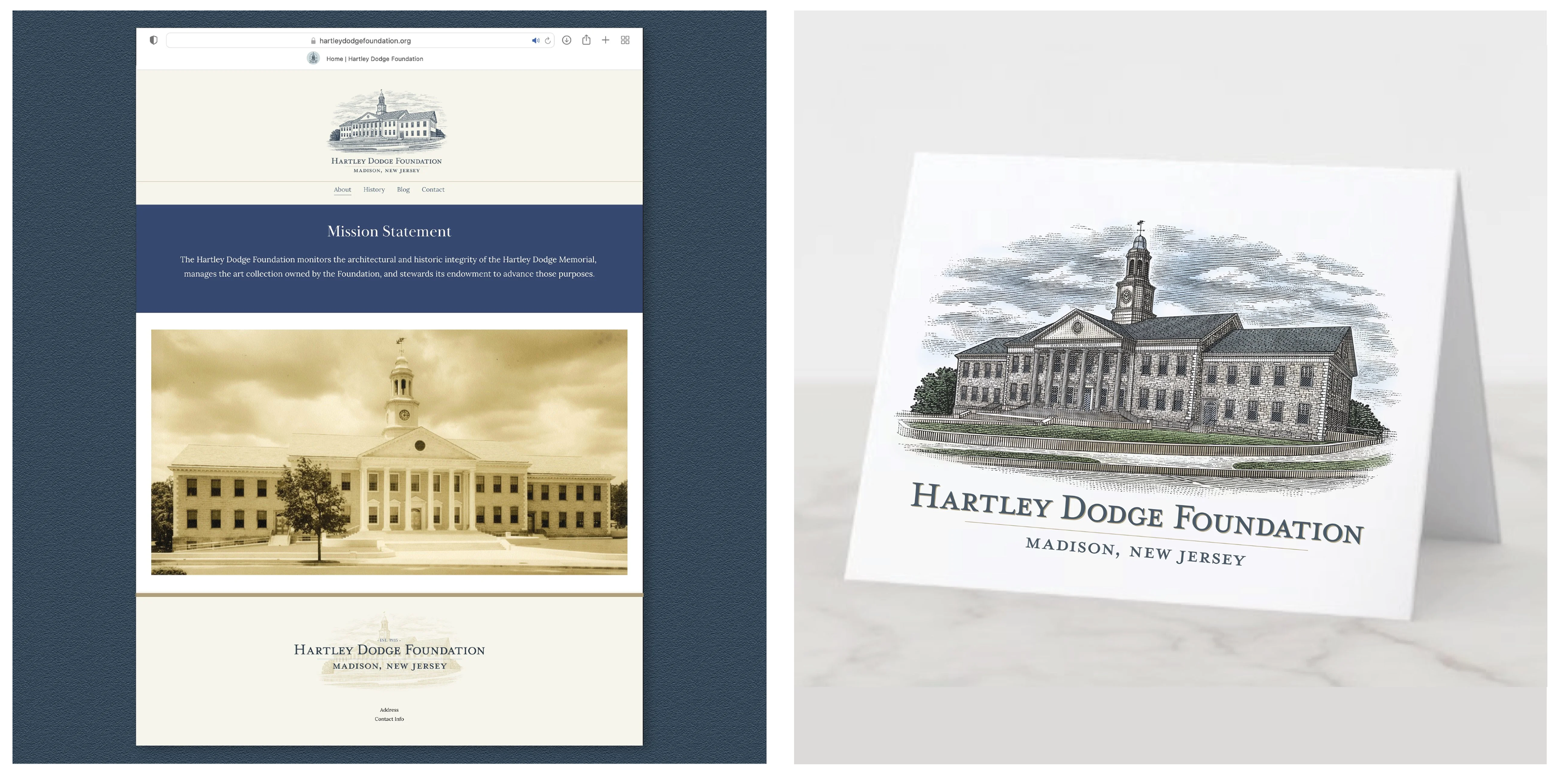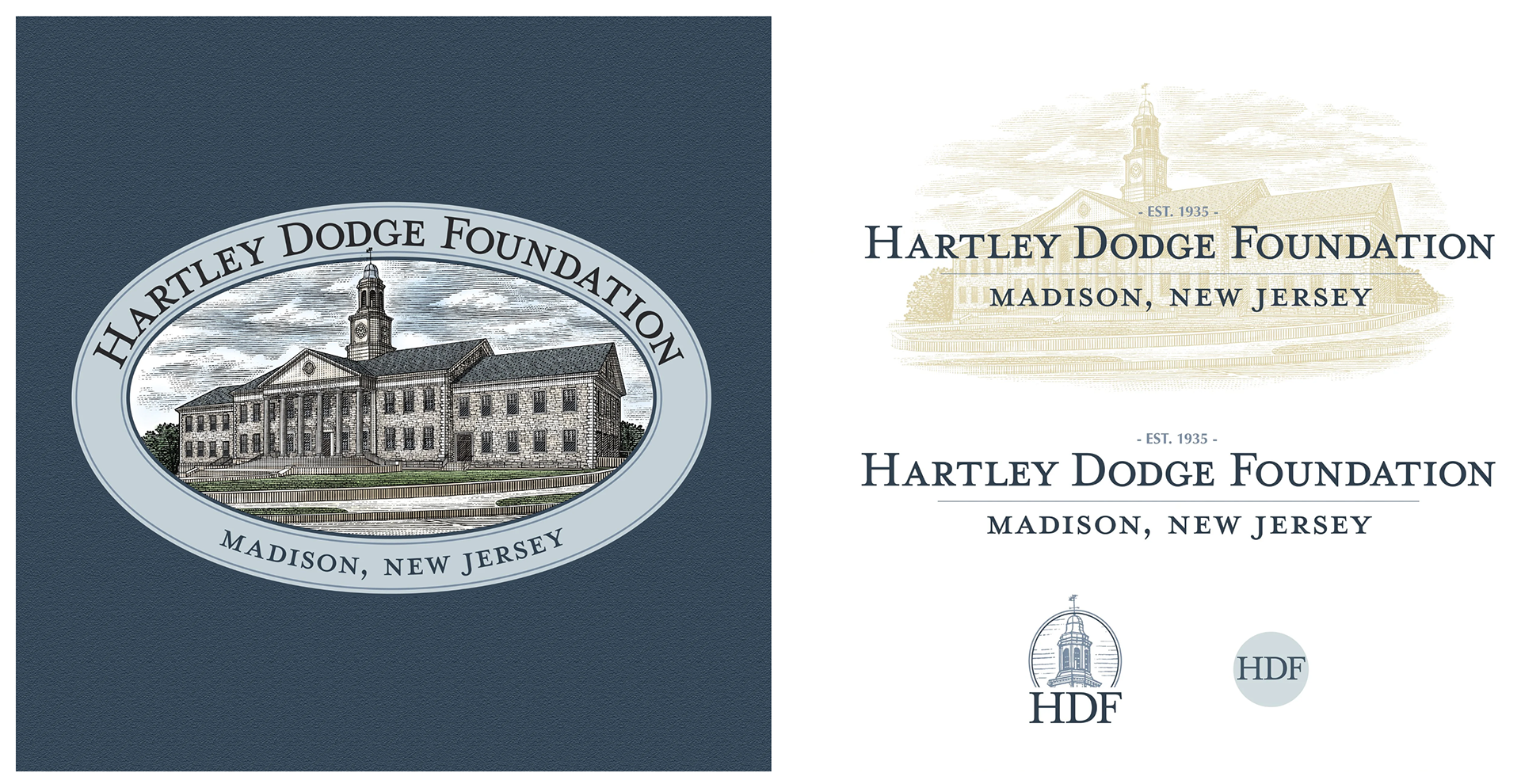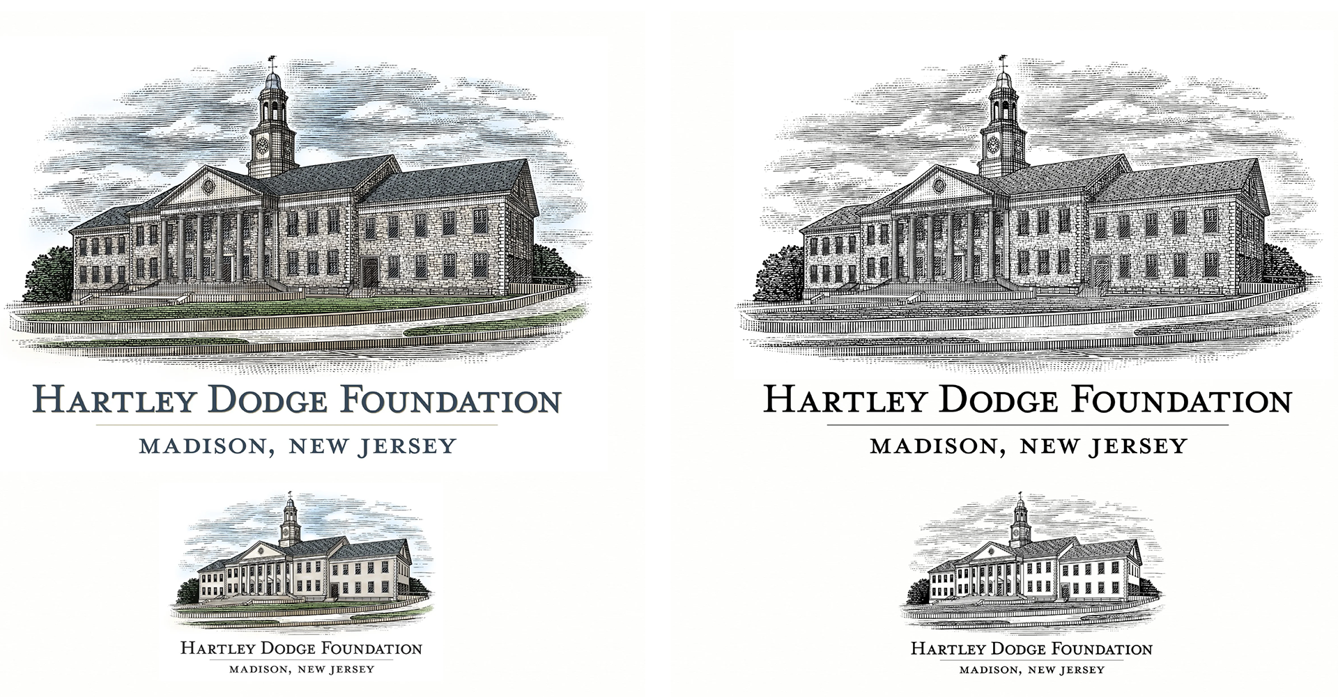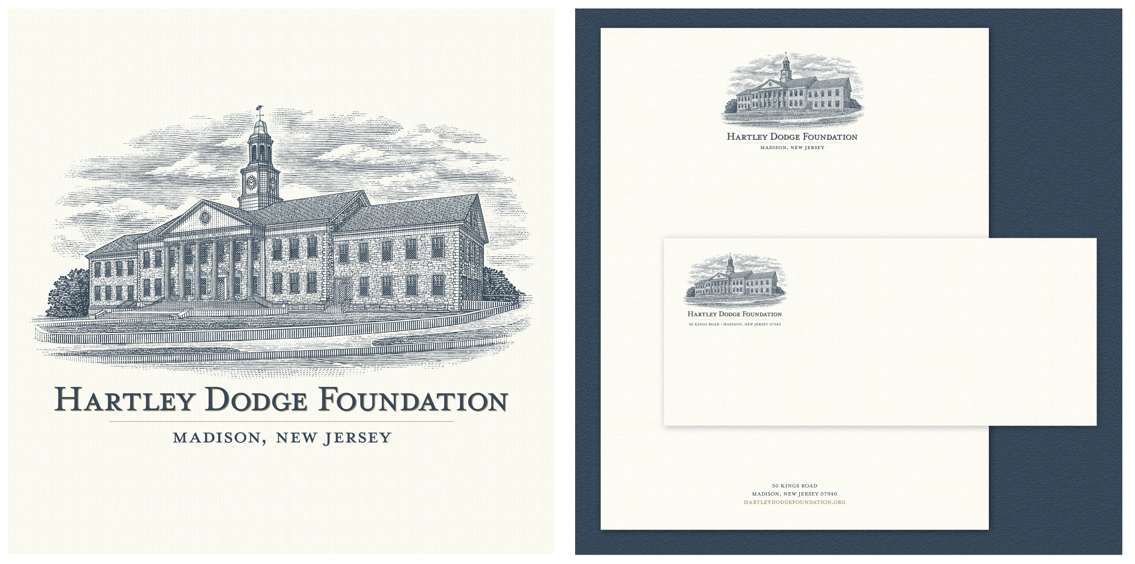 Pfeifer Design created a unique Logo for the Hartley Dodge Foundation, who manages the historic integrity and maintenance of the Hartley Dodge Memorial building, which serves as the borough hall in Madison, NJ. The building was given to the borough of Madison by Geraldine Rockefeller Dodge, and is a focal point landmark of the town. Because their role is centered around the building, they wanted a logo that would highlight the building, and felt that an illustration was the best way to do this. Under the direction of Pfeifer Design, a scratchboard illustration was created by illustrator Steven Noble in a detailed and simplified version, to allow for flexibility when using the logo at different sizes and applications, as well as a color version of both. Pfeifer Design created the logo design that incorporates the illustration, and developed brand colors and typography for them to use on their website, and identity elements such as stationery. Additional type-only versions of the logo were created, for further flexibility for their branding.