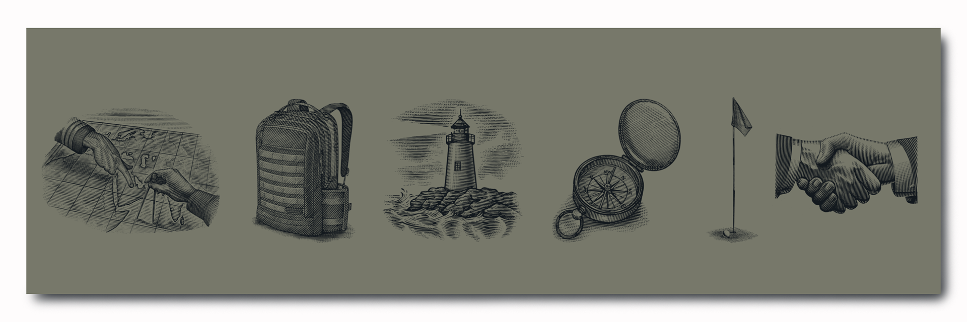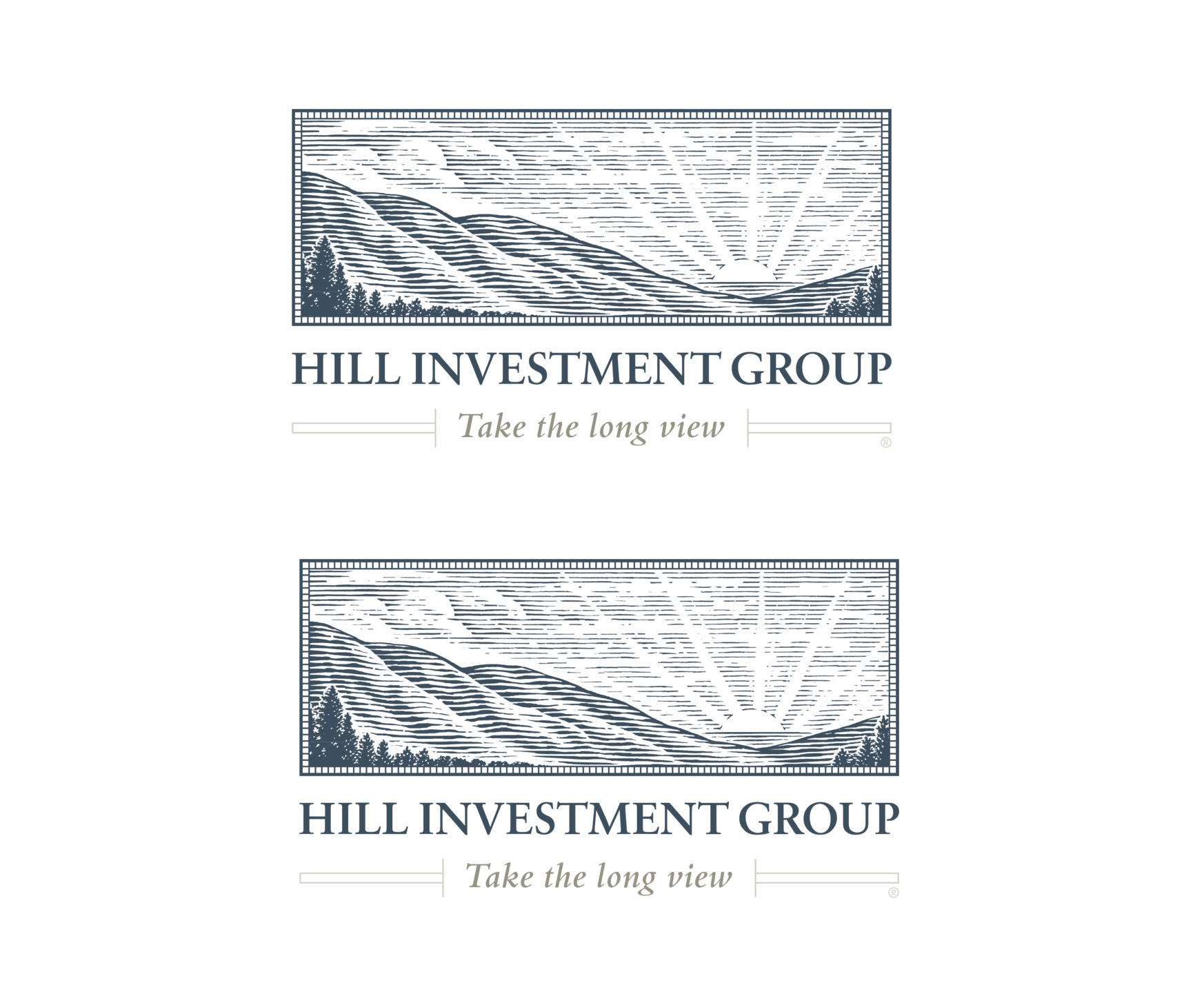 Hill Investment Group, established back in 2005, tasked Steven Noble with creating their logo mark which includes a landscape scene with a sun setting in the distance and mountains in the foreground. This scene symbolizes their philosophy which is “taking the long view” approach to investing. The final artwork was illustrated in a woodcut style approach that connects to that traditional “heritage” look and feel. Additional icon illustrations were added to complement the logo.