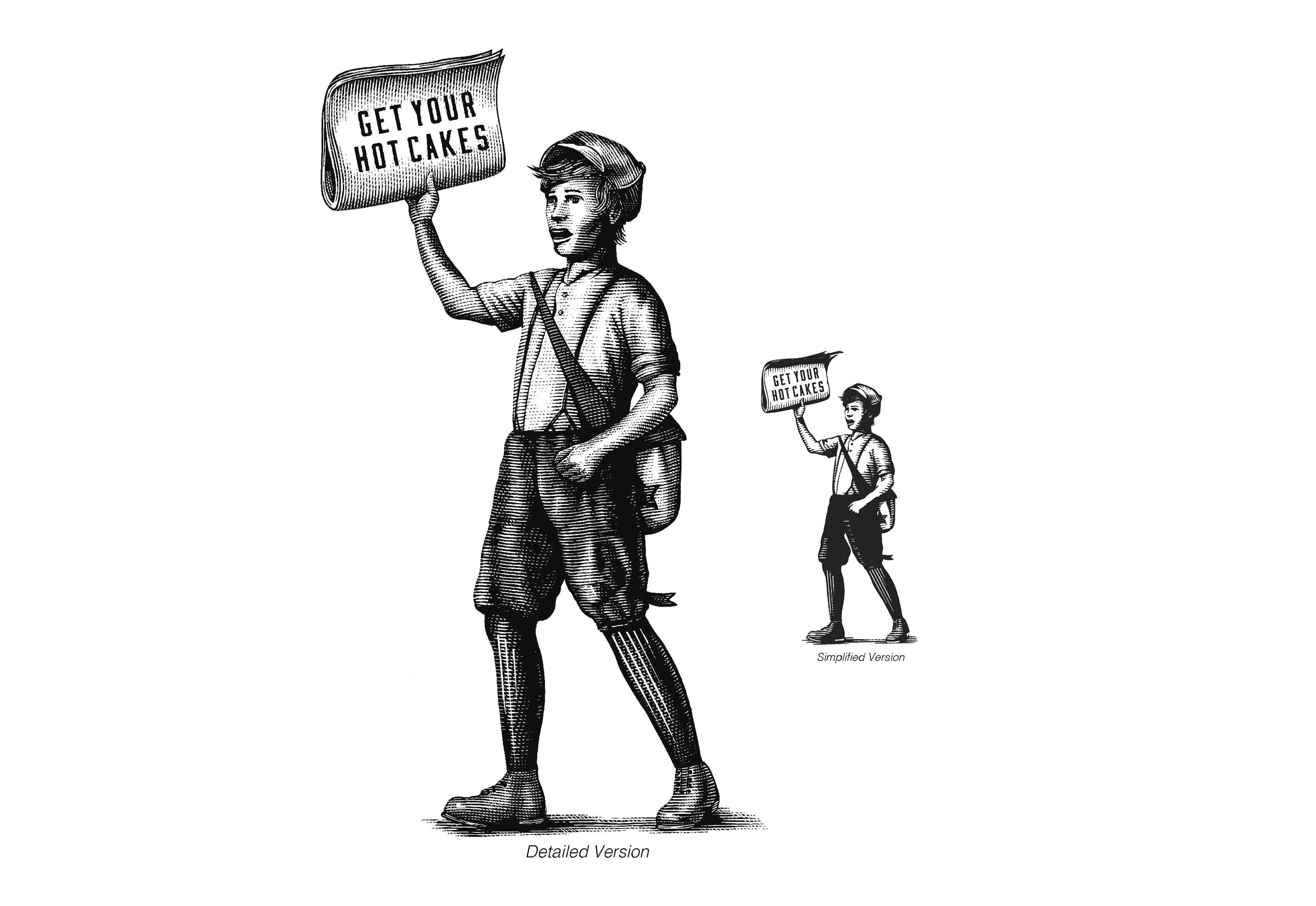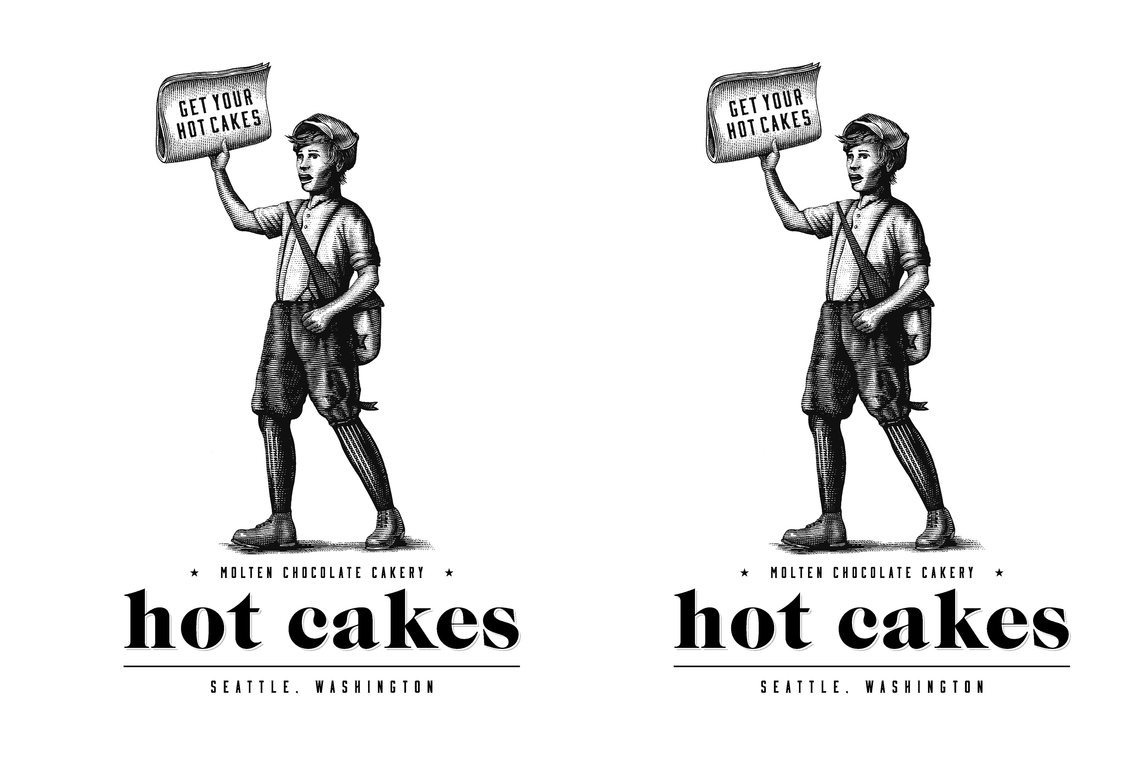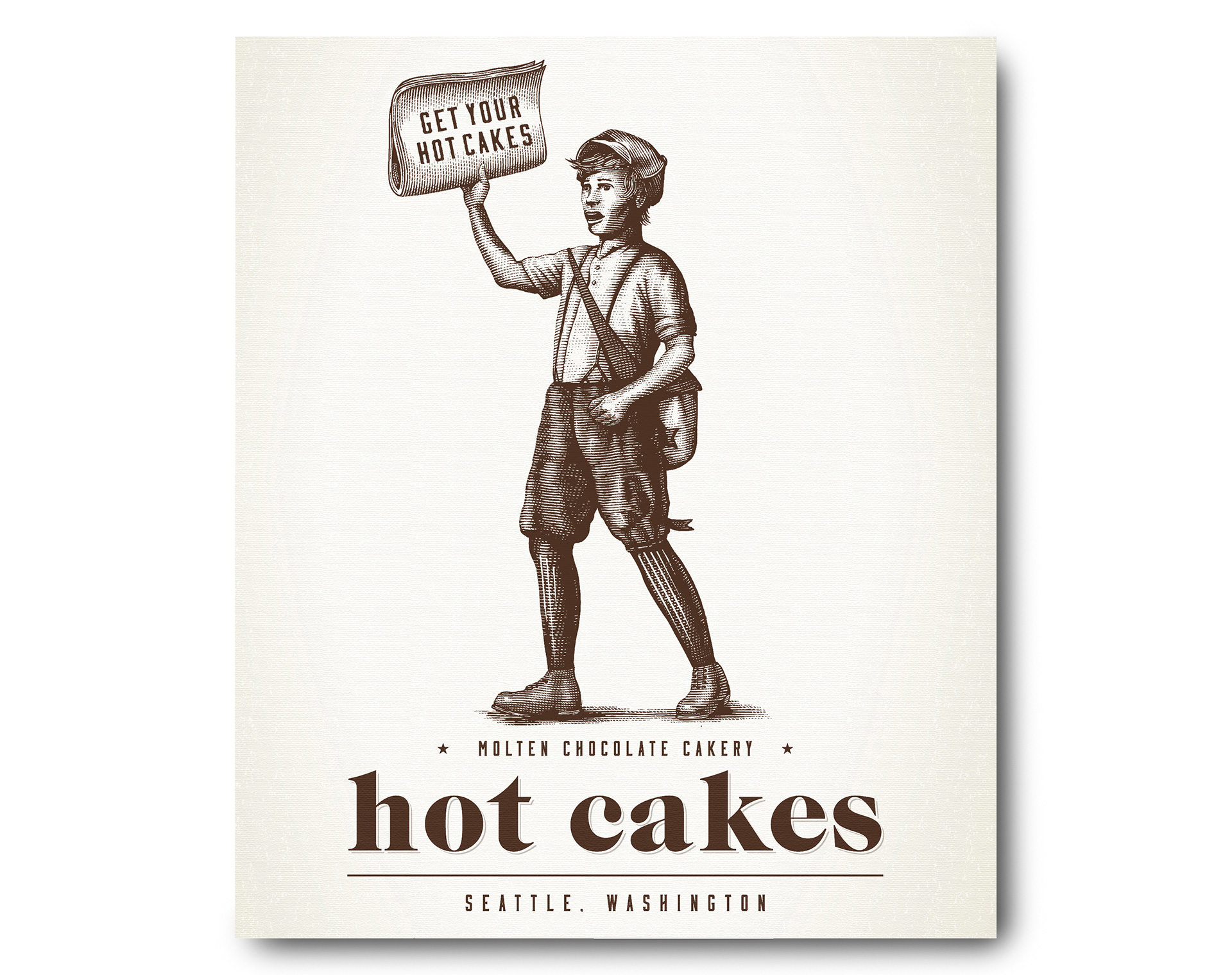 Steven Noble was tasked to create a logo mark for Hot Cakes which is a Molten Chocolate Cakery organic dessert restaurant and brand located in Seattle, Washington. The custom illustration includes a paperboy walking and holding-up a newspaper up with his right hand with the words “Get Your Hot Cakes” printed on it. Two separate versions were created for simplified and detailed versions rendered in a scratchboard woodcut/engraving vintage style.