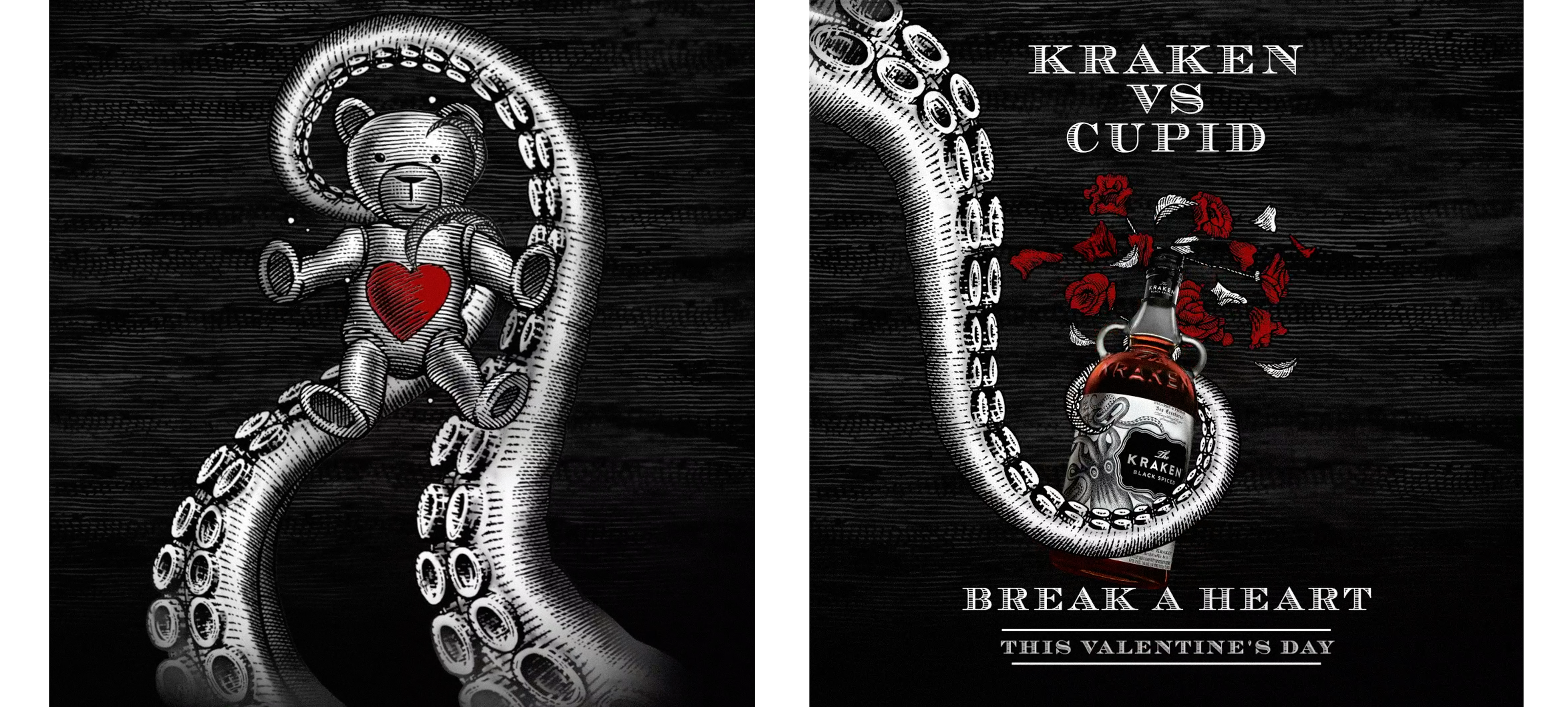 Kraken Rum commissioned Steven Noble to render illustrations for their Valentine’s Day Kraken vs Cupid “Break a Heart” campaign that were adapted in the animations. Kraken Black Spiced Rum is a Caribbean black spiced rum. It is distributed in the United States by Proximo Spirits, and named after the kraken, a mythical giant squid-like sea monster. The illustrations were created in a etching style.