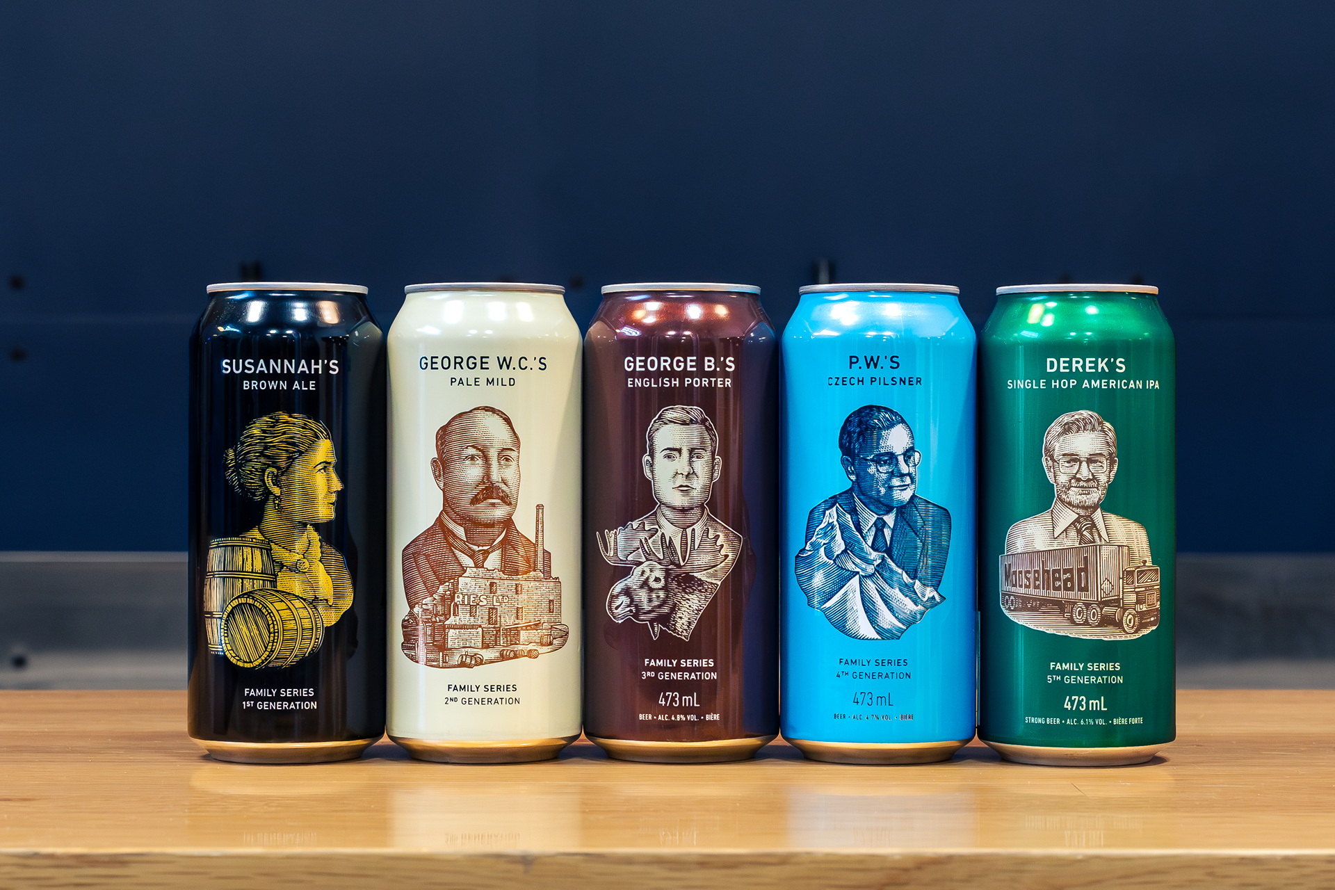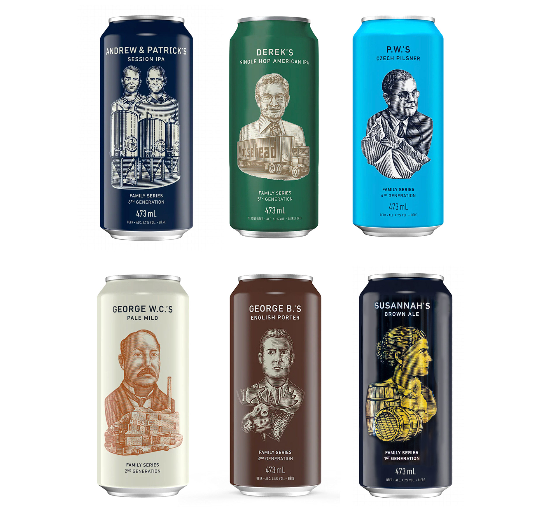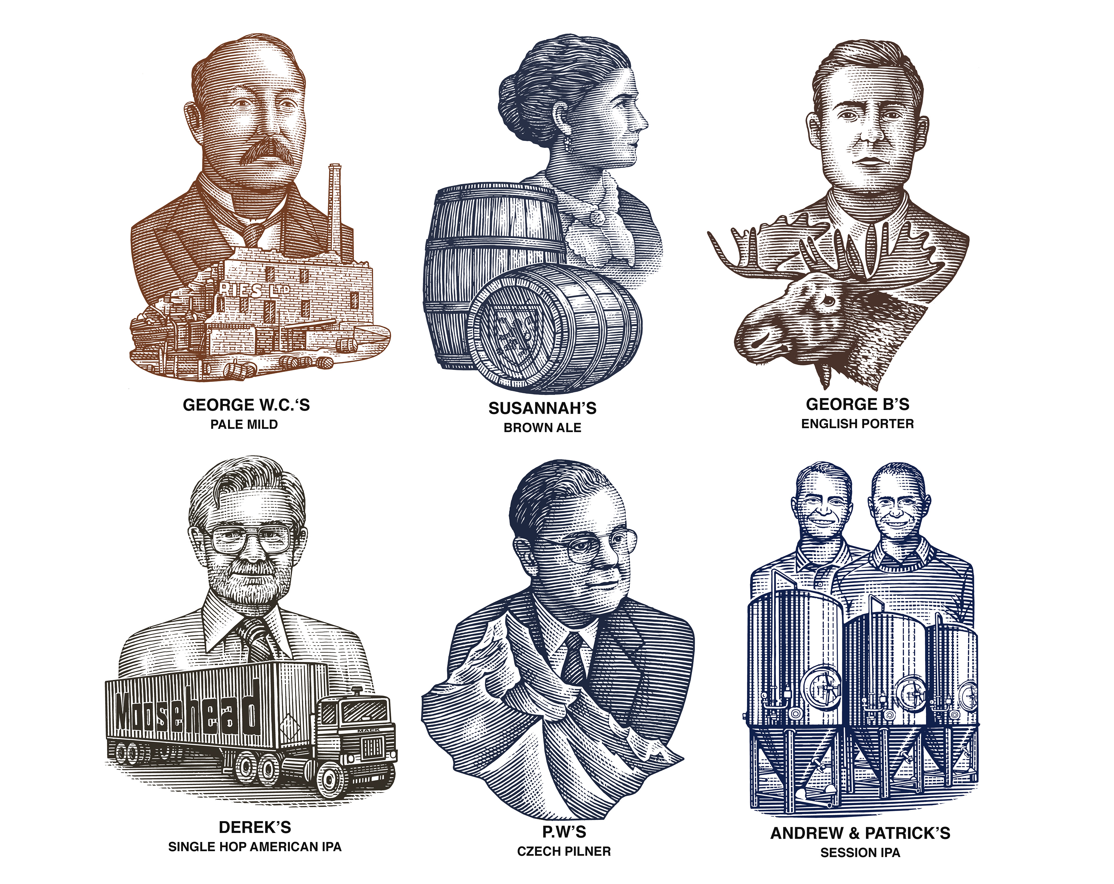 Moosehead Breweries commissioned Steven Noble once again to create their new series of Small Batch beer illustrated labels that includes: Andrew & Patrick’s Session IPA, Dereks’ Single Hop American IPA, P.W.’s Czech Pilsner, George’s W.C’s, George’s B’s English Porter. These custom illustrations represent the history, legacy and heritage of Moosehead beer from generation to generation (2nd - 6th generations). Illustrations were created in a scratchboard woodcut style similar to the original logo mark.