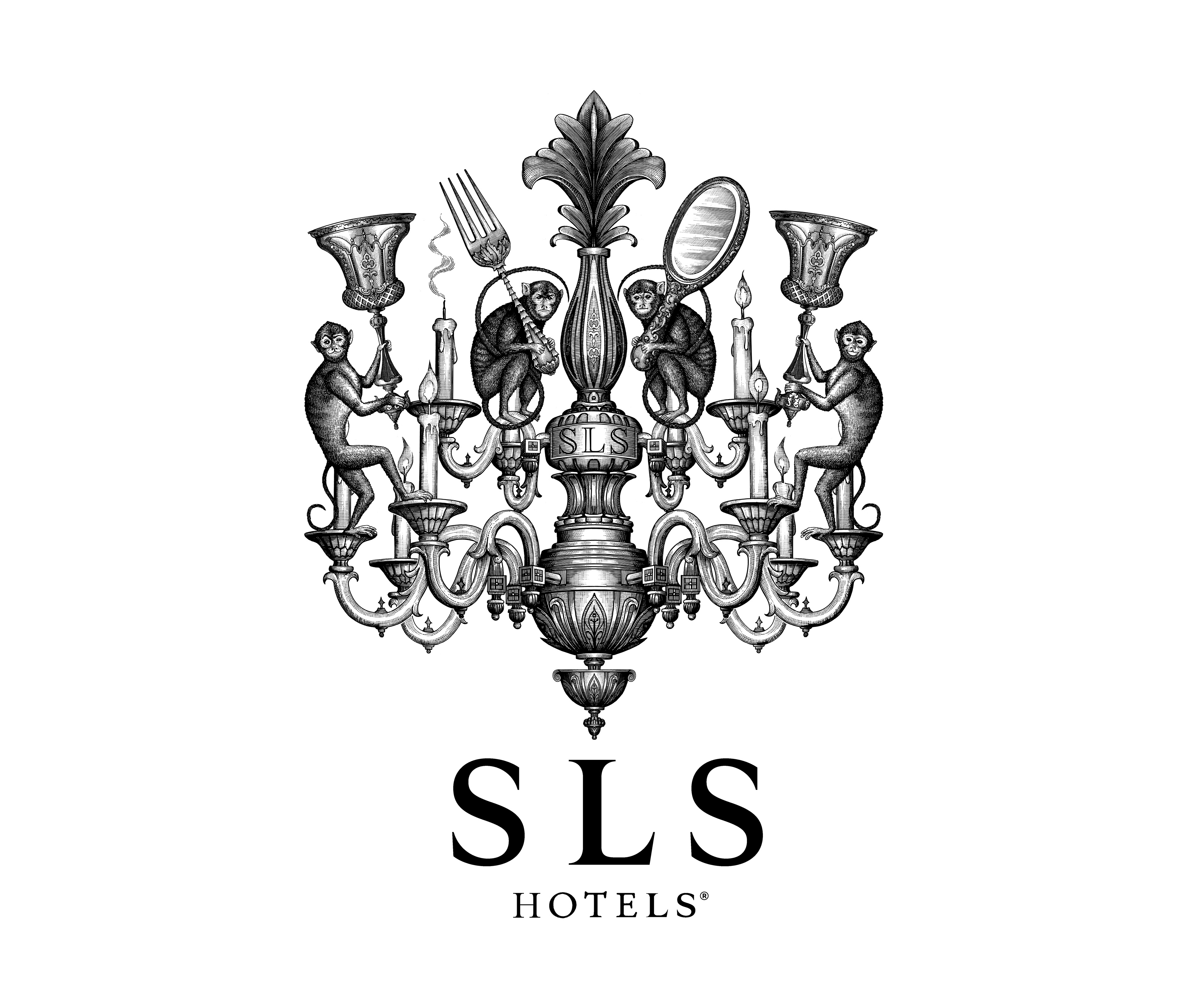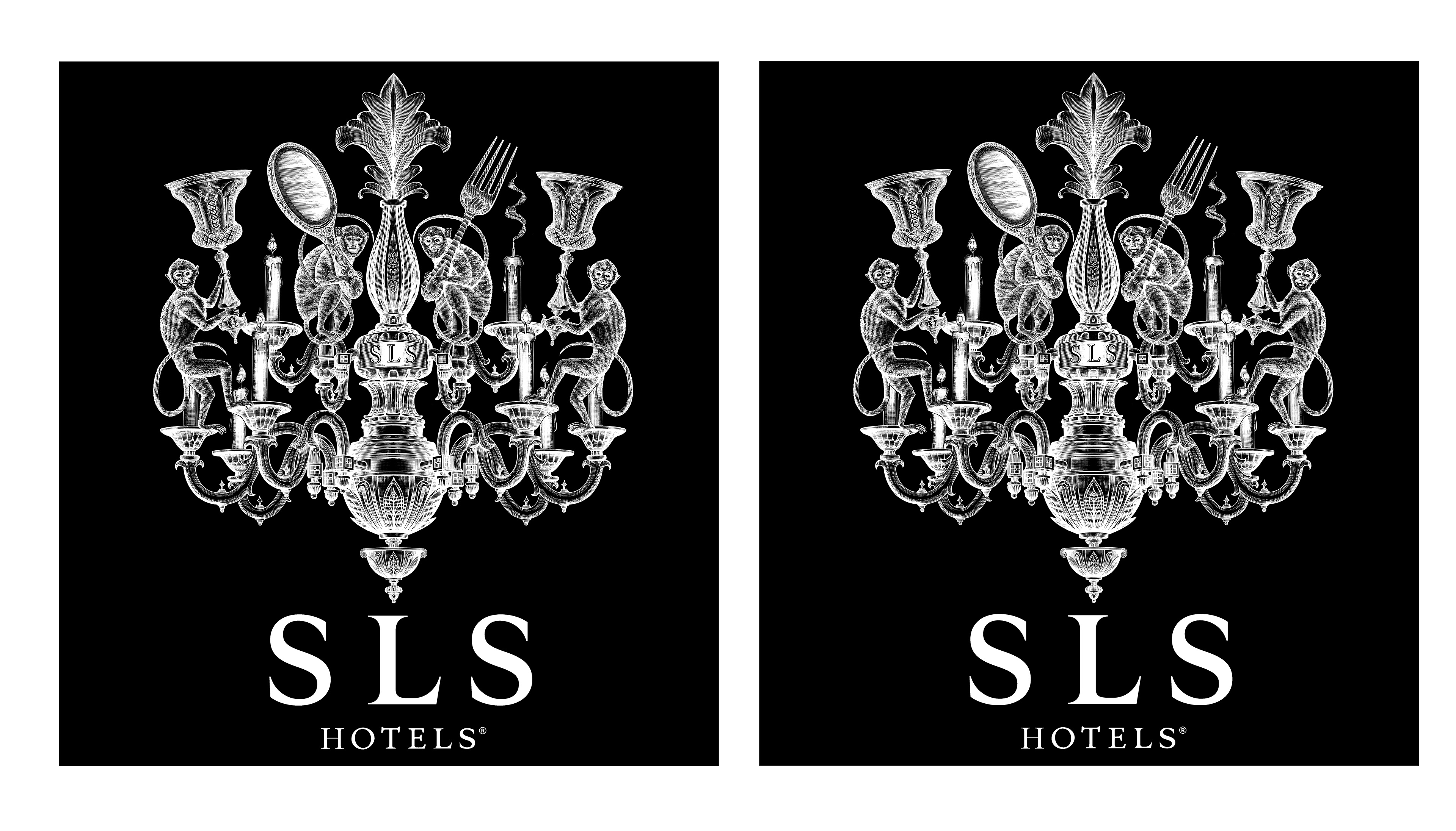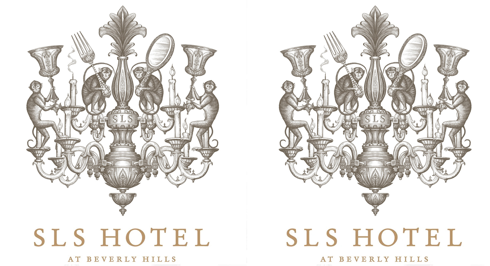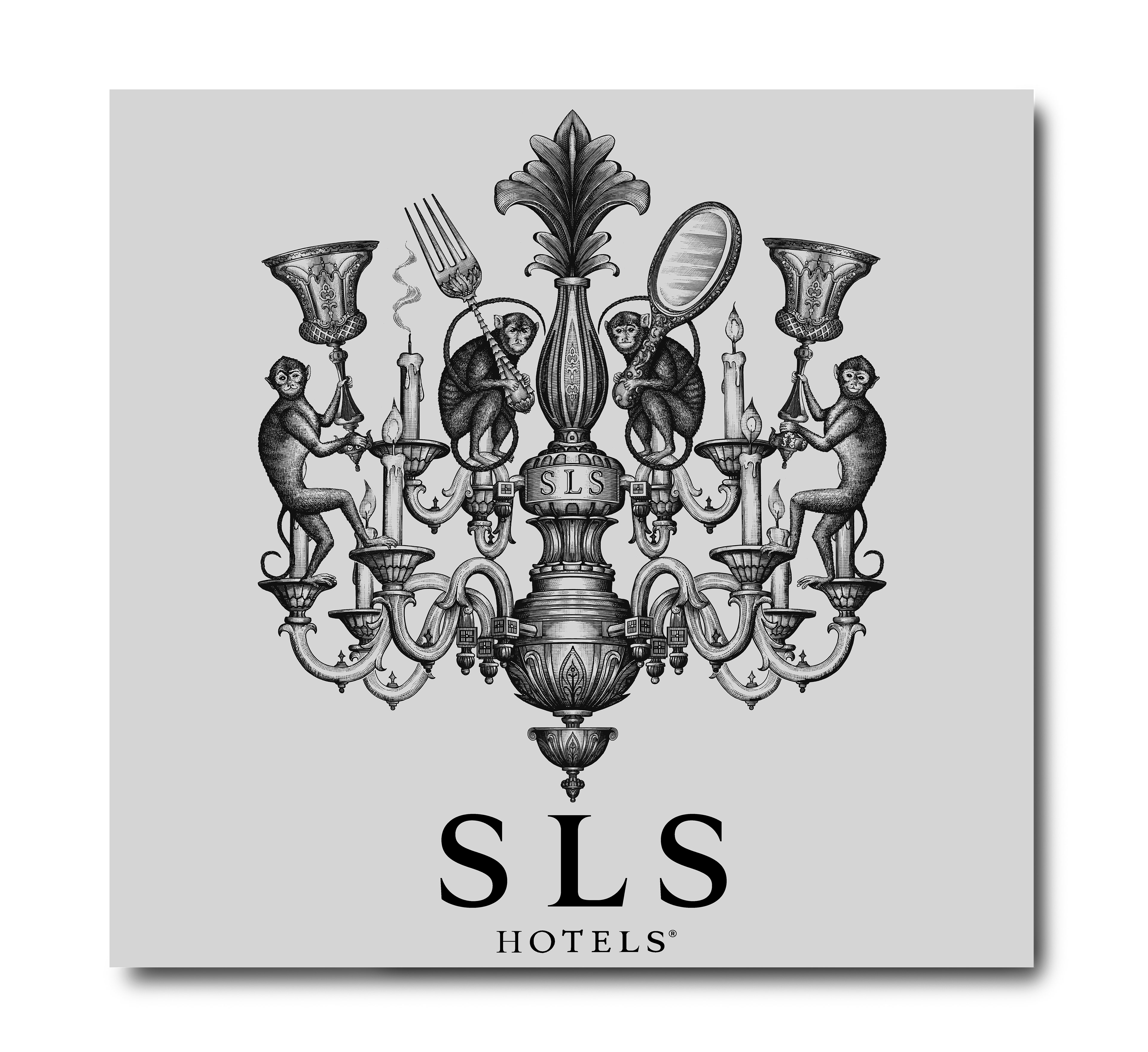 Steven Noble was commissioned by SLS Hotels and GBH in London to design the custom illustration logo identity for their sub-branding stationary as well as for all their room collateral in the style of this mischievous baroque slice of European culture for all their hotels. The identity's monkeys surprise and delight guests in every detail. The chandelier was originally modeled after Steven Noble's own dining room chandelier. Each monkey was individually illustrated and layered over the chandelier for animation purposes.