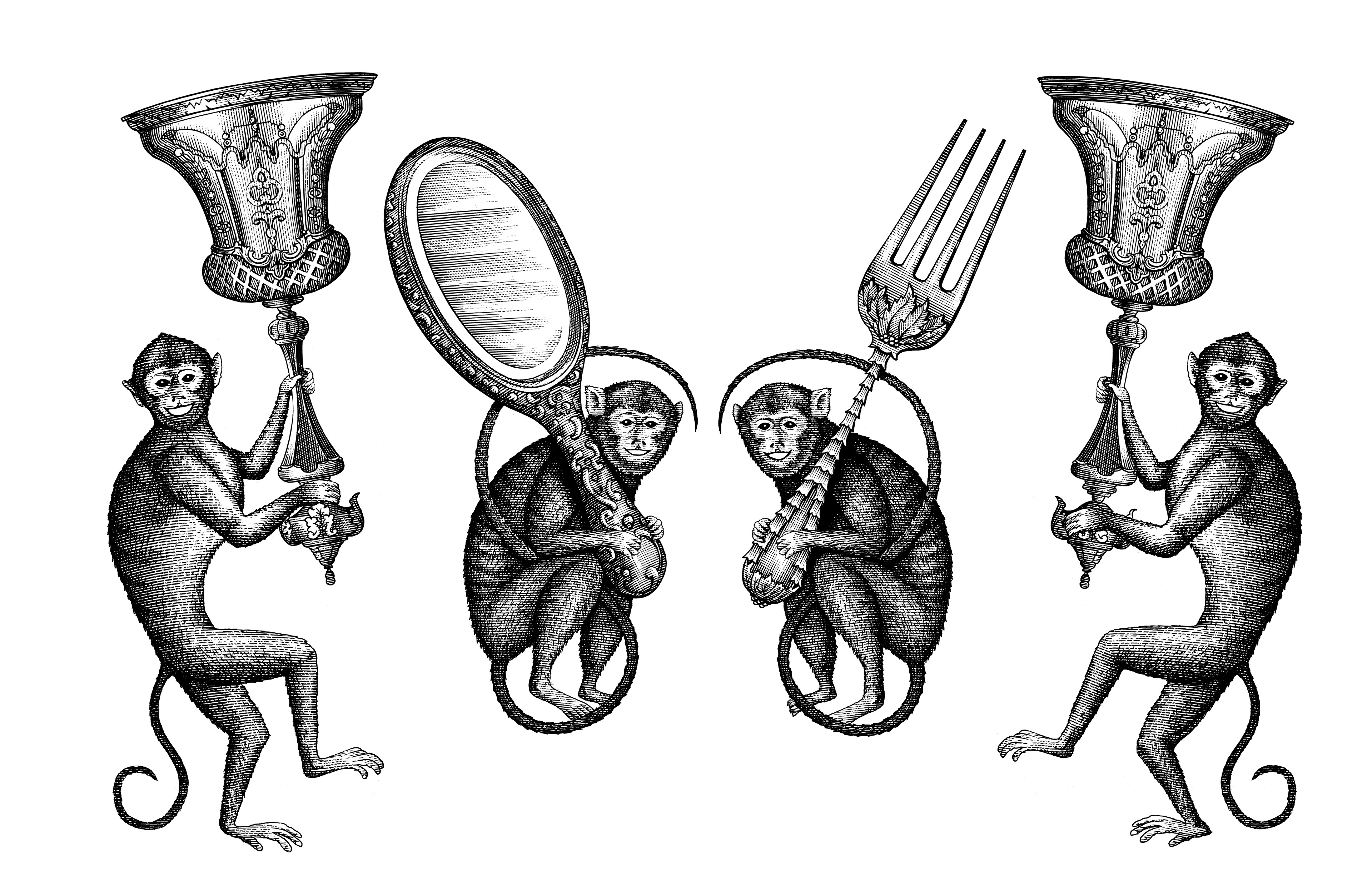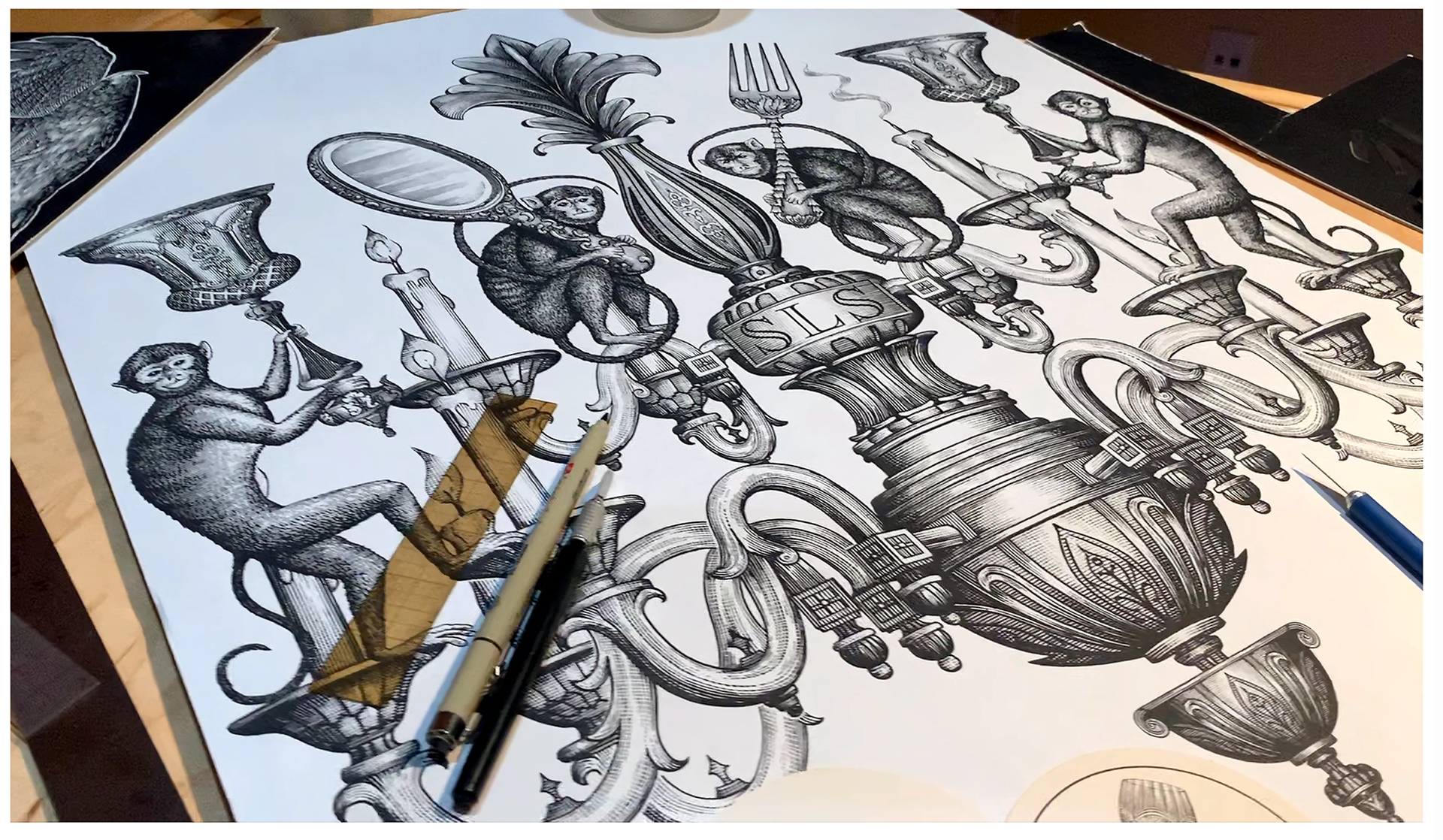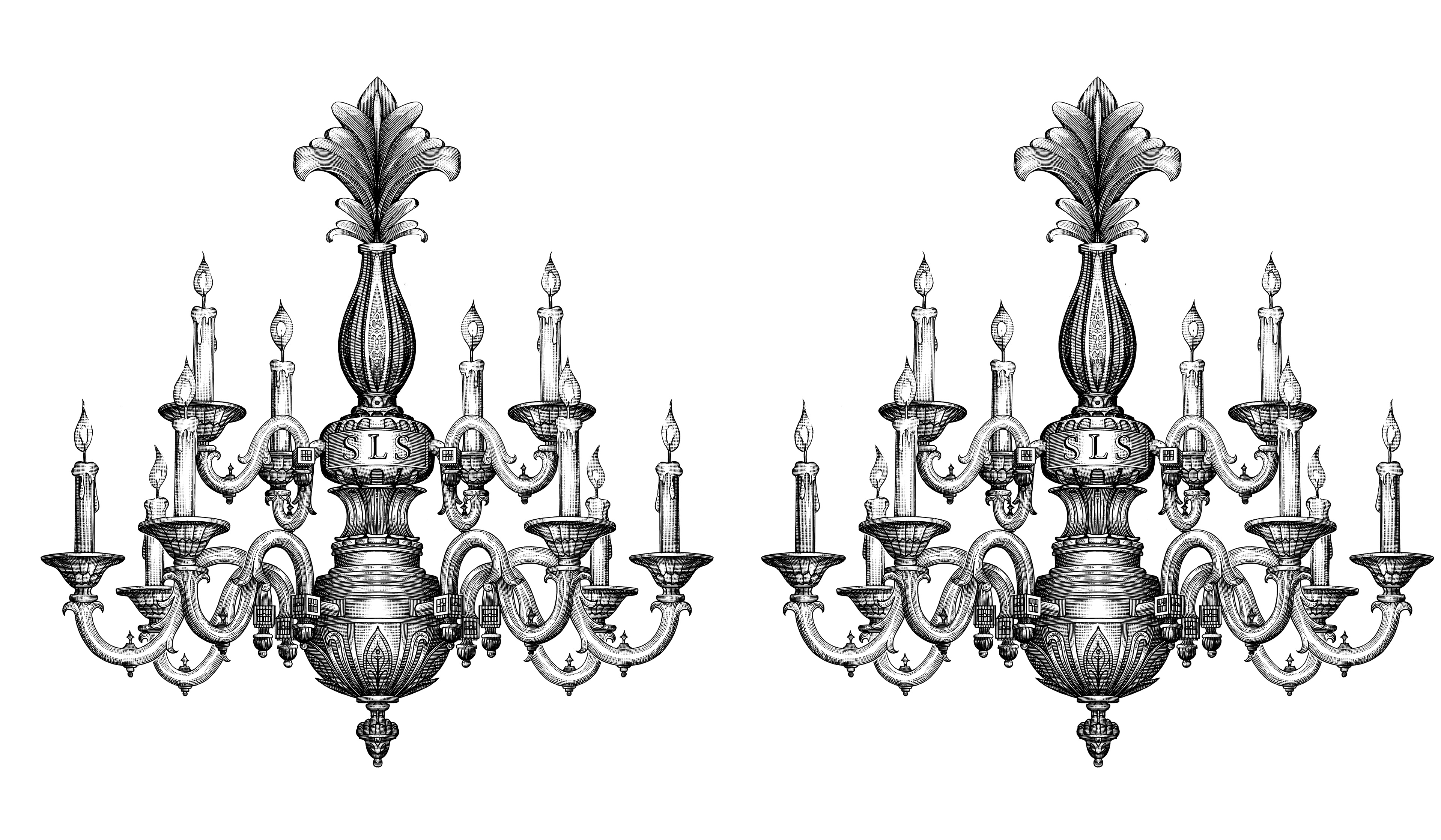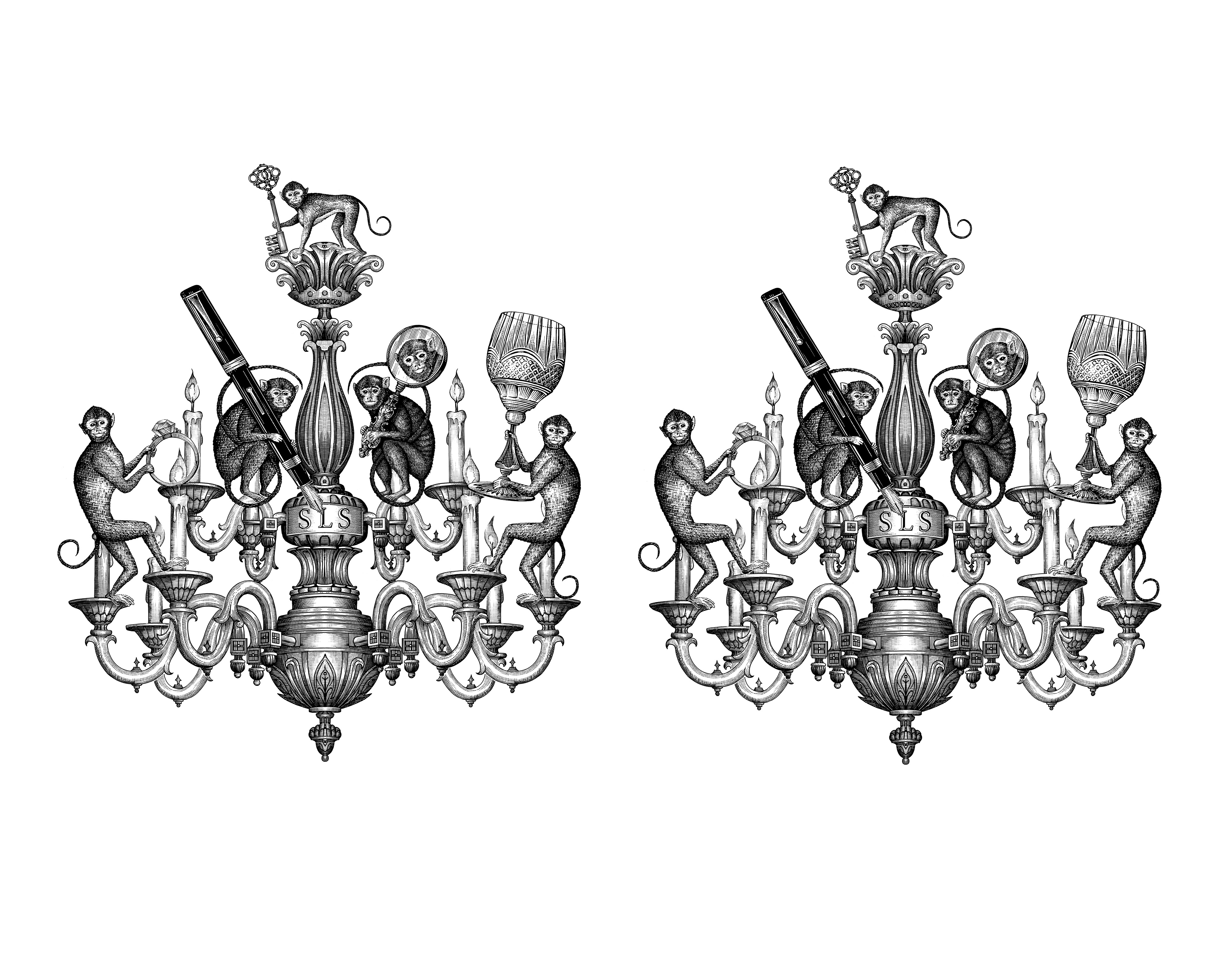 Steven Noble was commissioned by SLS Hotels and GBH in London to design the custom illustration logo identity for their sub-branding stationary as well as for all their room collateral in the style of this mischievous baroque slice of European culture for all their hotels. The identity's monkeys surprise and delight guests in every detail. The chandelier was originally modeled after Steven Noble's own dining room chandelier. Each monkey was individually illustrated and layered over the chandelier for animation purposes.