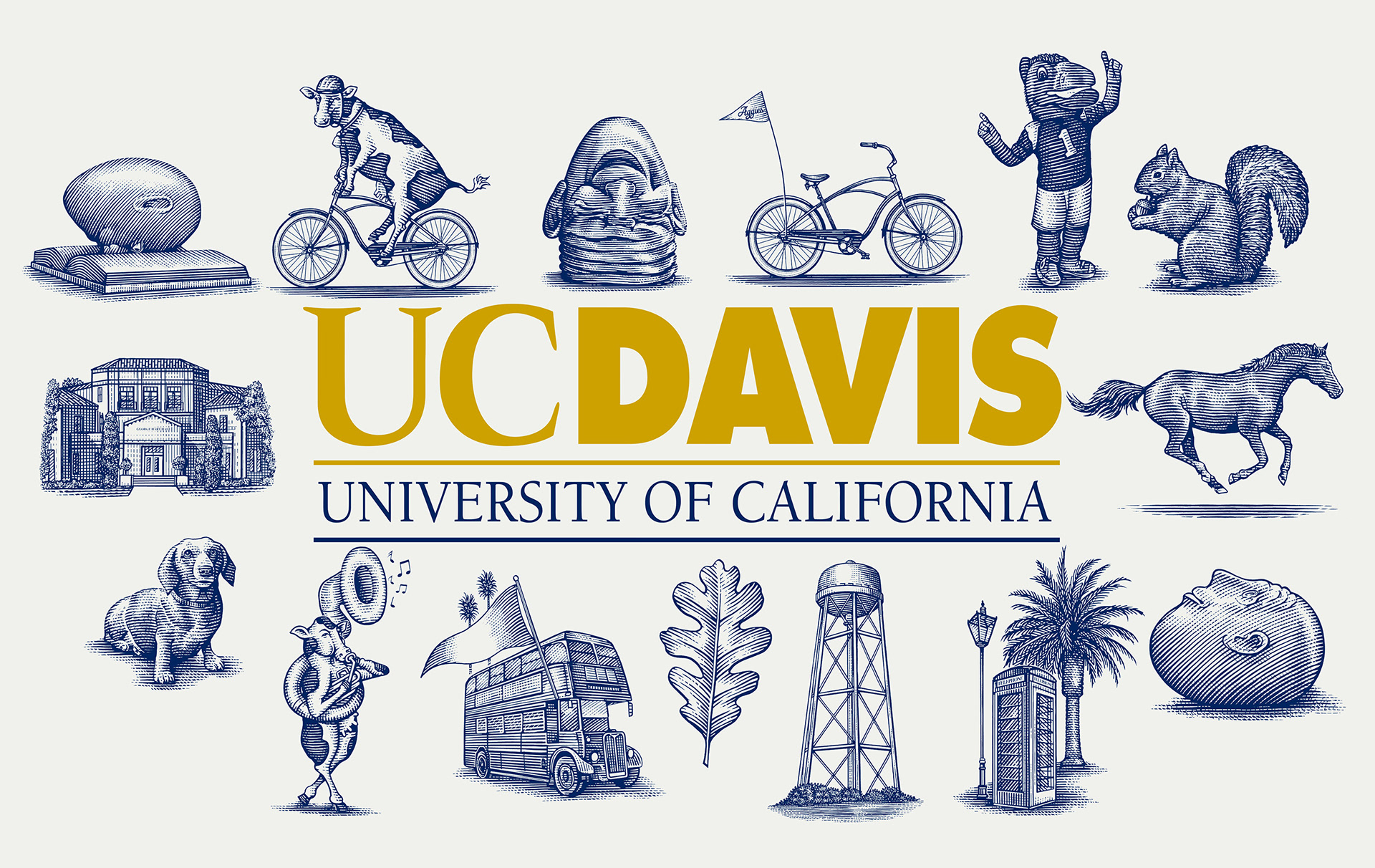 University of California, Davis (USD) commissioned Steven Noble to create some custom brand marks for the university to be used on their print and digital materials for the Sacaramento International Airport and as wells for the Sacramento Transit Trains The aim behind these campus icons was also to be a little whimsical and/or tongue-in-cheek in nature such as the cow riding the bicycle or an egghead rolling on the ground. The overall goal of this rebrand was to reposition UC Davis as a top-tier, internationally-recognized university that is uniquely suited to tackle the problems of the 21st century.